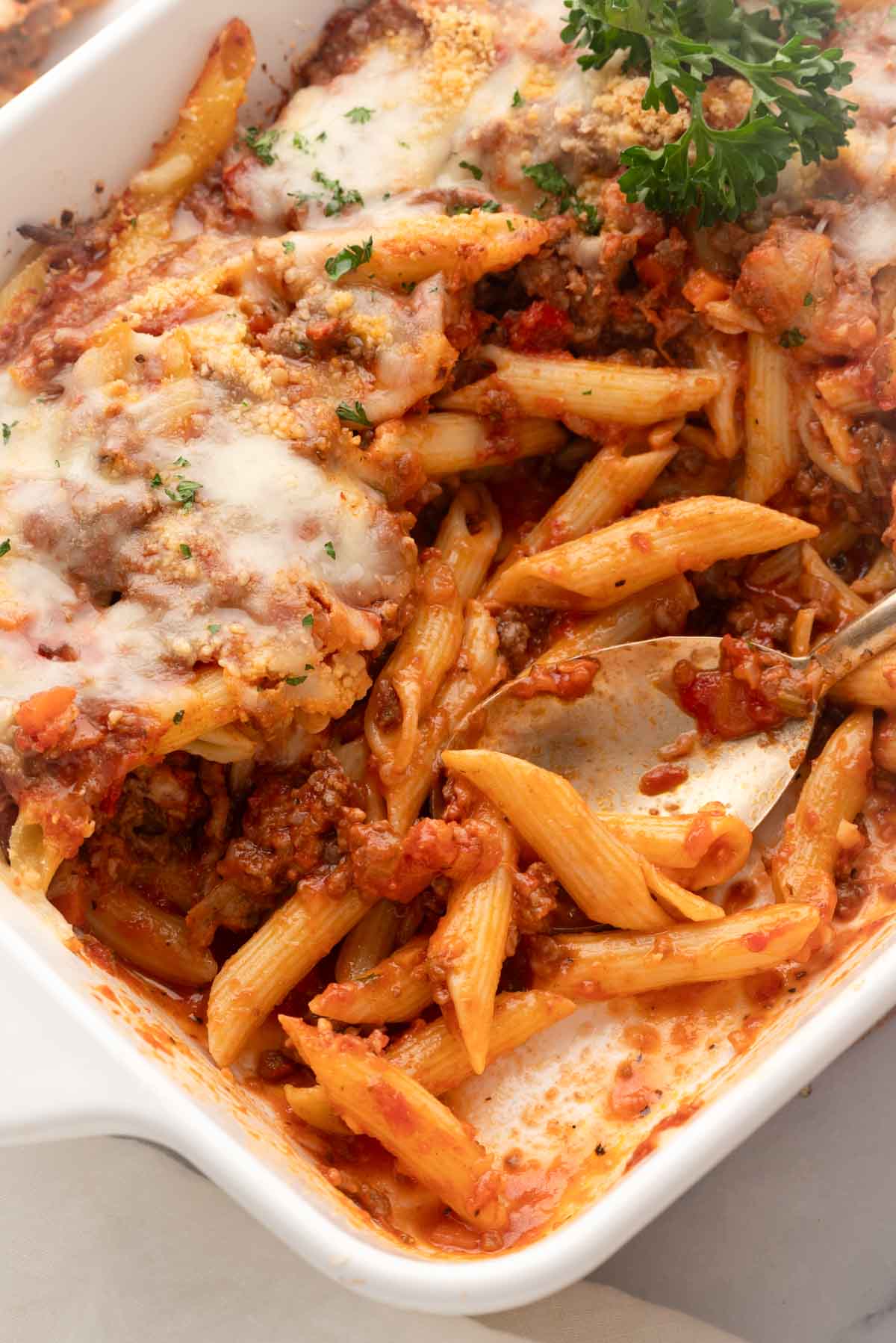 – Swap the ground beef for a lighter option. We’ve also made this pasta bake with ground turkey, fresh turkey sausage, and ground chicken.