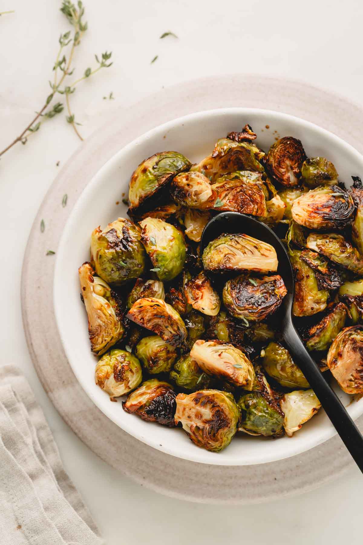 You can buy your Brussels sprouts already halved from the store to cut the prep time down to less than 5 minutes. It’s one of our favorite quick meal prep solutions.