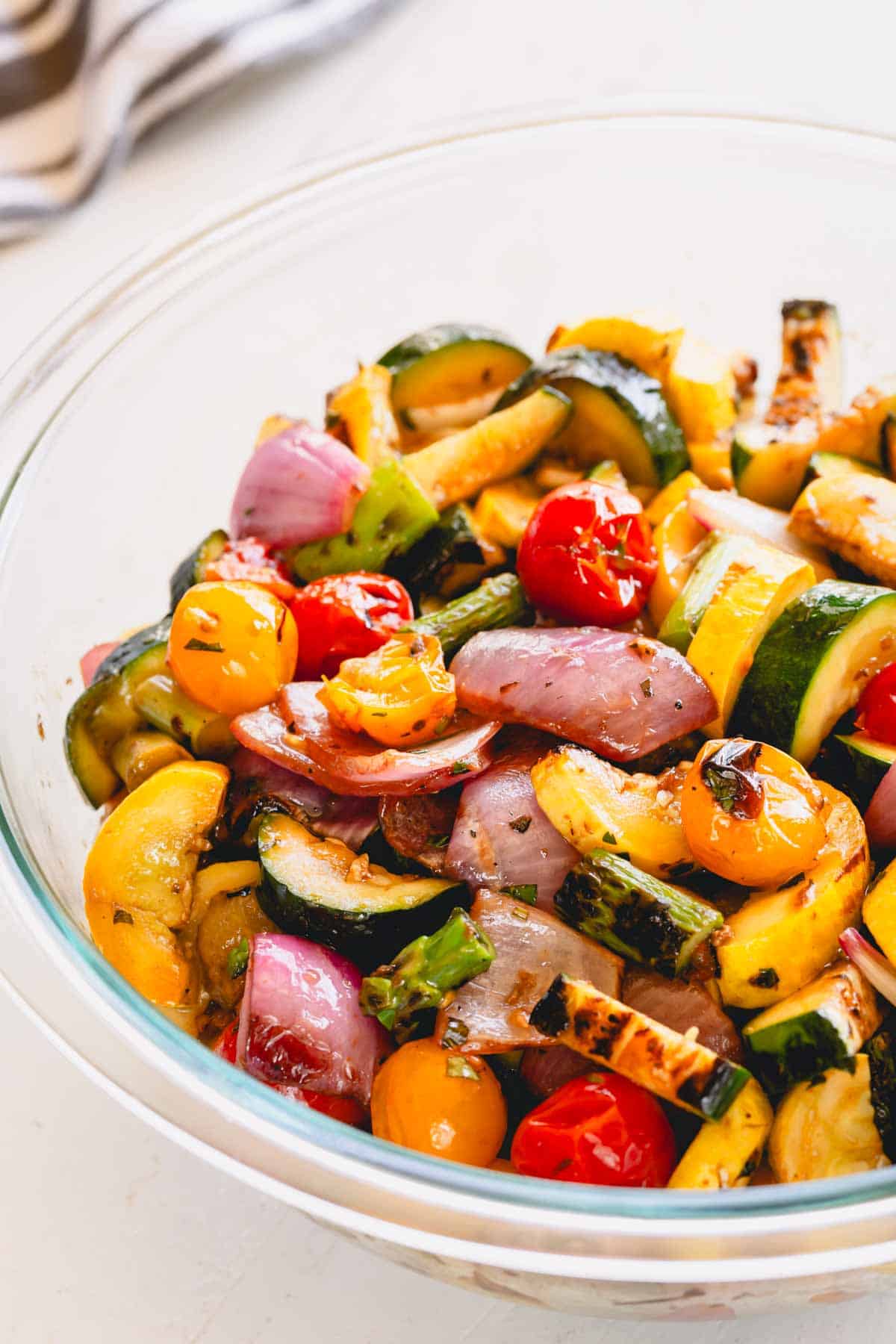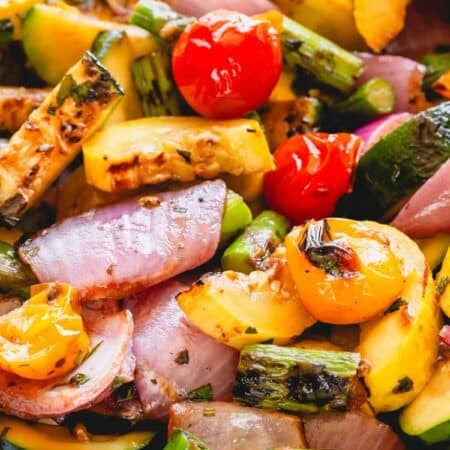 There’s not much this grilled vegetables recipe doesn’t pair well with! I love to serve it with protein-rich main courses such as honey mustard roasted salmon, ribeye steak, and stovetop chicken thighs.