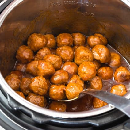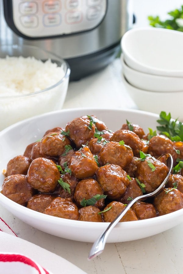 This BBQ meatballs recipe is served over long-grain white rice, cooked right in the Instant Pot with the meatballs! However, you could skip the rice and serve BBQ meatballs over Instant Pot mashed potatoes, Instant Pot pasta, or skillet mac and cheese.