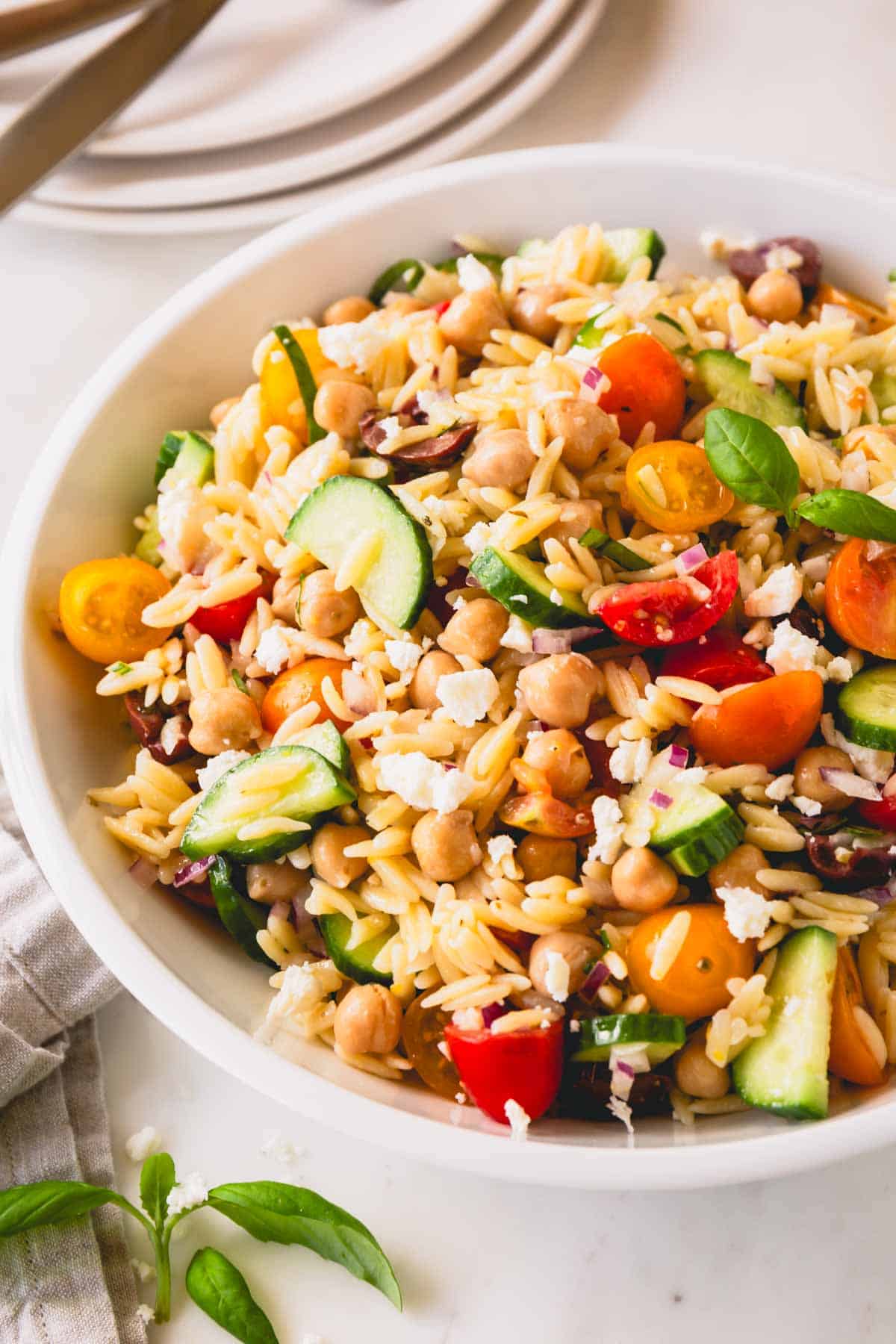 This Greek orzo pasta salad is the ultimate summer recipe that uses just a handful of ingredients. We love this salad since it’s great made in advance (in fact it’s better, since it gives the flavors time to marinate together!). It’s the first side dish gone at backyard barbecues, block parties, and picnics because of it’s delicious, vibrant flavor.