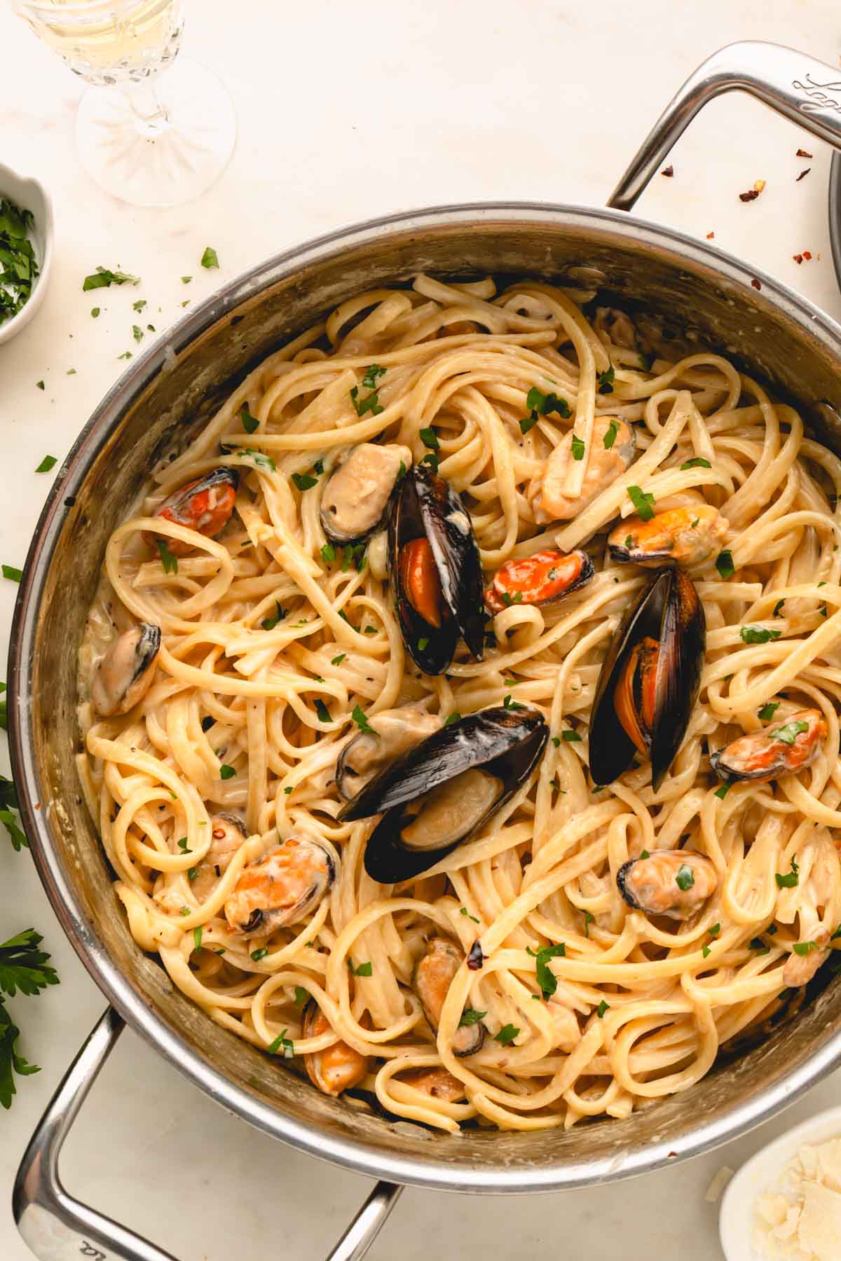 - Linguini – Long pasta noodles are best for this mussels pasta because they coat in the white wine cream sauce nicely.