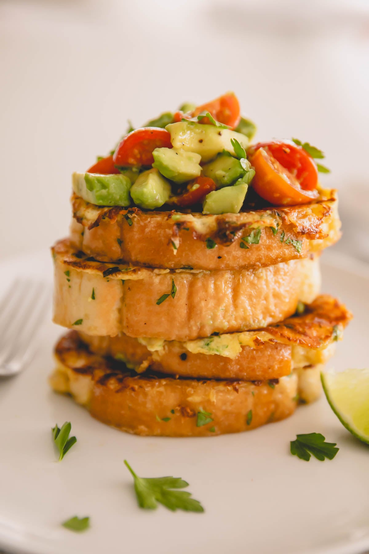 If you’ve never tried savory French toast, you’re in for a treat. It’s the ideal recipe to get out of the breakfast, lunch, or dinner time rut. Quick and easy to prepare, it’s a flavorful, nutritious meal. My mom used to make this for us when we were kids. I added cheddar cheese to my version because it makes the flavor even better. Topping it with the fresh avocado and tomato salad adds a colorful garnish that’s kid-approved too (my kids love it!).