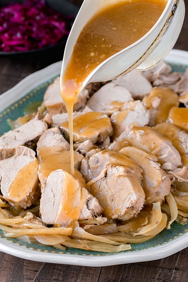 - Transfer the pork and onions onto a platter. Tent with foil and let it rest for 10 minutes, while you finish the sauce.