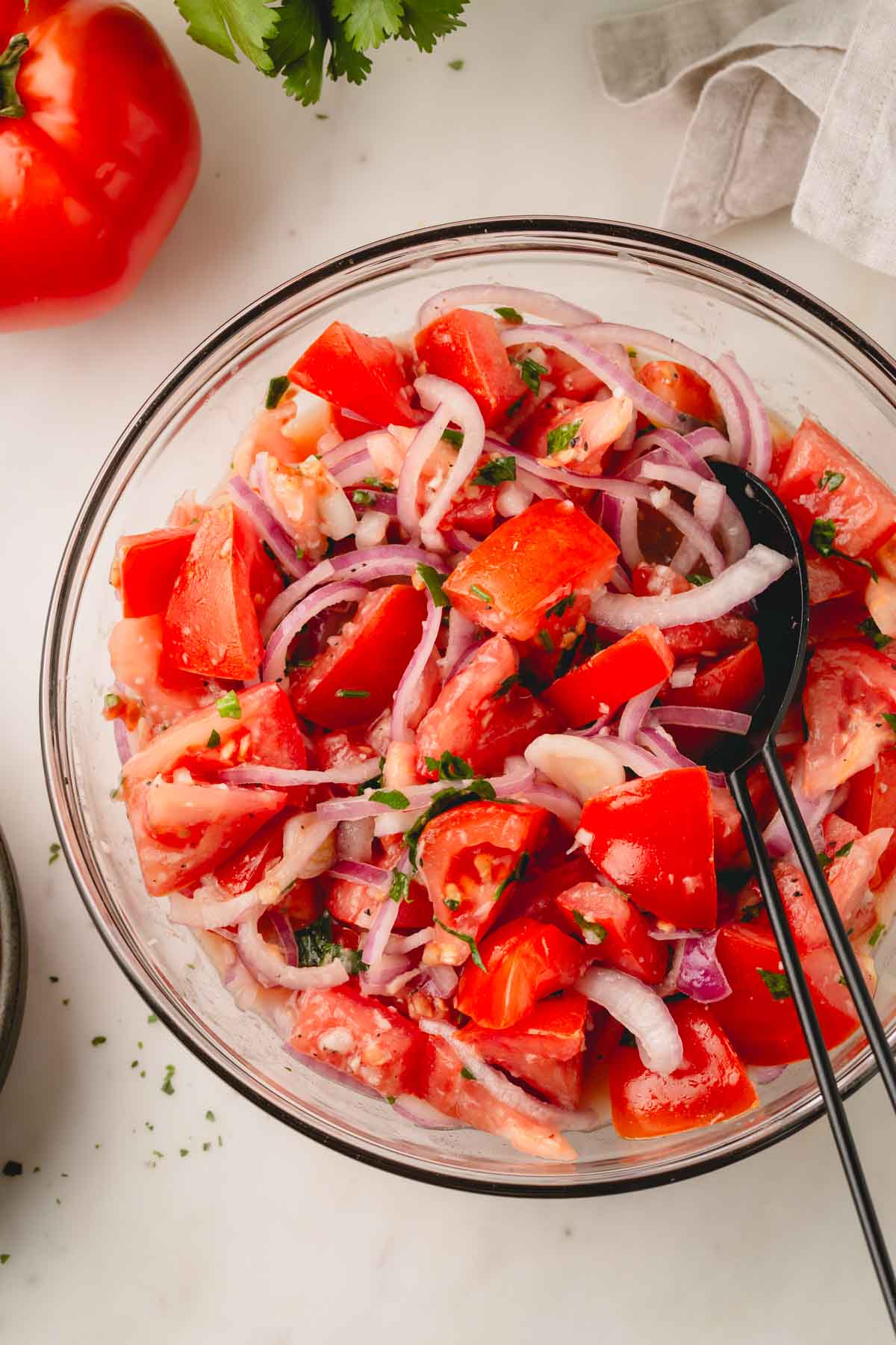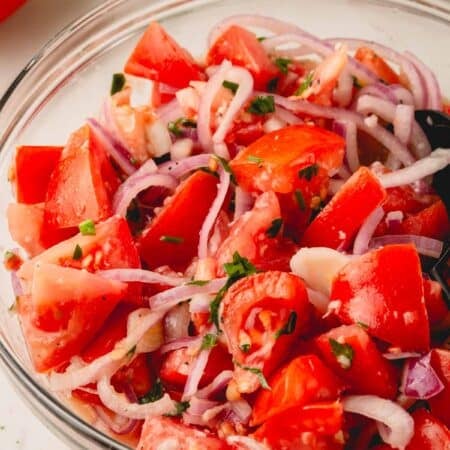 This tomato and onion salad is our favorite side of summer that uses only a handful of ingredients for easy meal prep. We’ve been making this recipe for years, it’s actually a side dish that we grew up eating at family gatherings and weeknight meals. With fresh parsley, red onion, and a hint of garlic, there’s so much to love about the vibrant flavors.